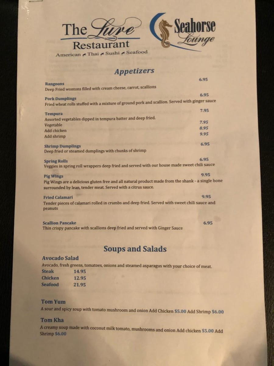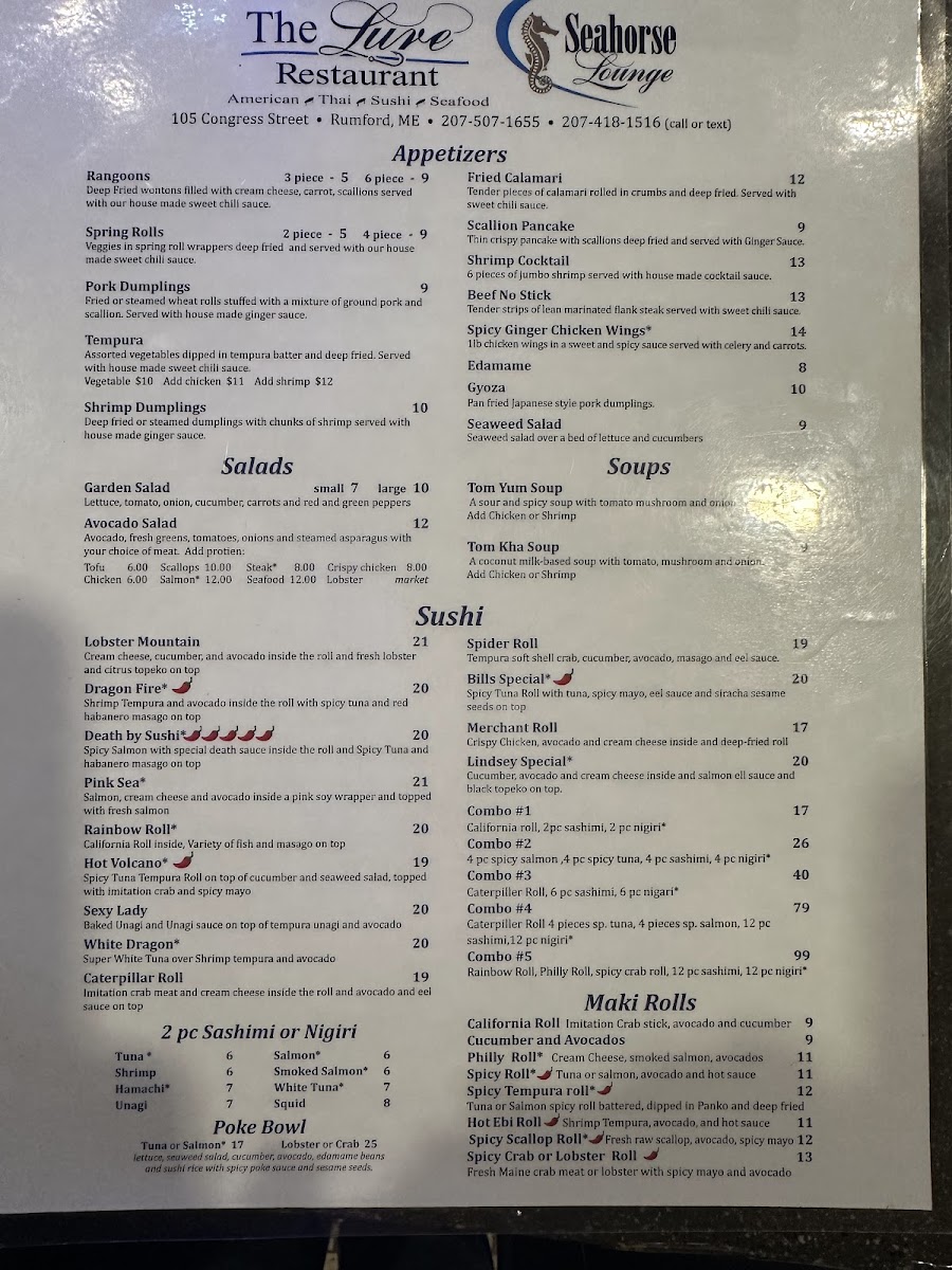 Welcome to The Lure, a culinary treasure nestled in Rumford, ME. At this cozy eatery, diners are treated to a diverse menu that highlights both classic and innovative Asian flavors. Start your meal with delightful appetizers such as crispy Rangoons or succulent Fried Calamari. For sushi lovers, the menu features tantalizing rolls like the extravagant Lobster Mountain and the playful Spider Roll.